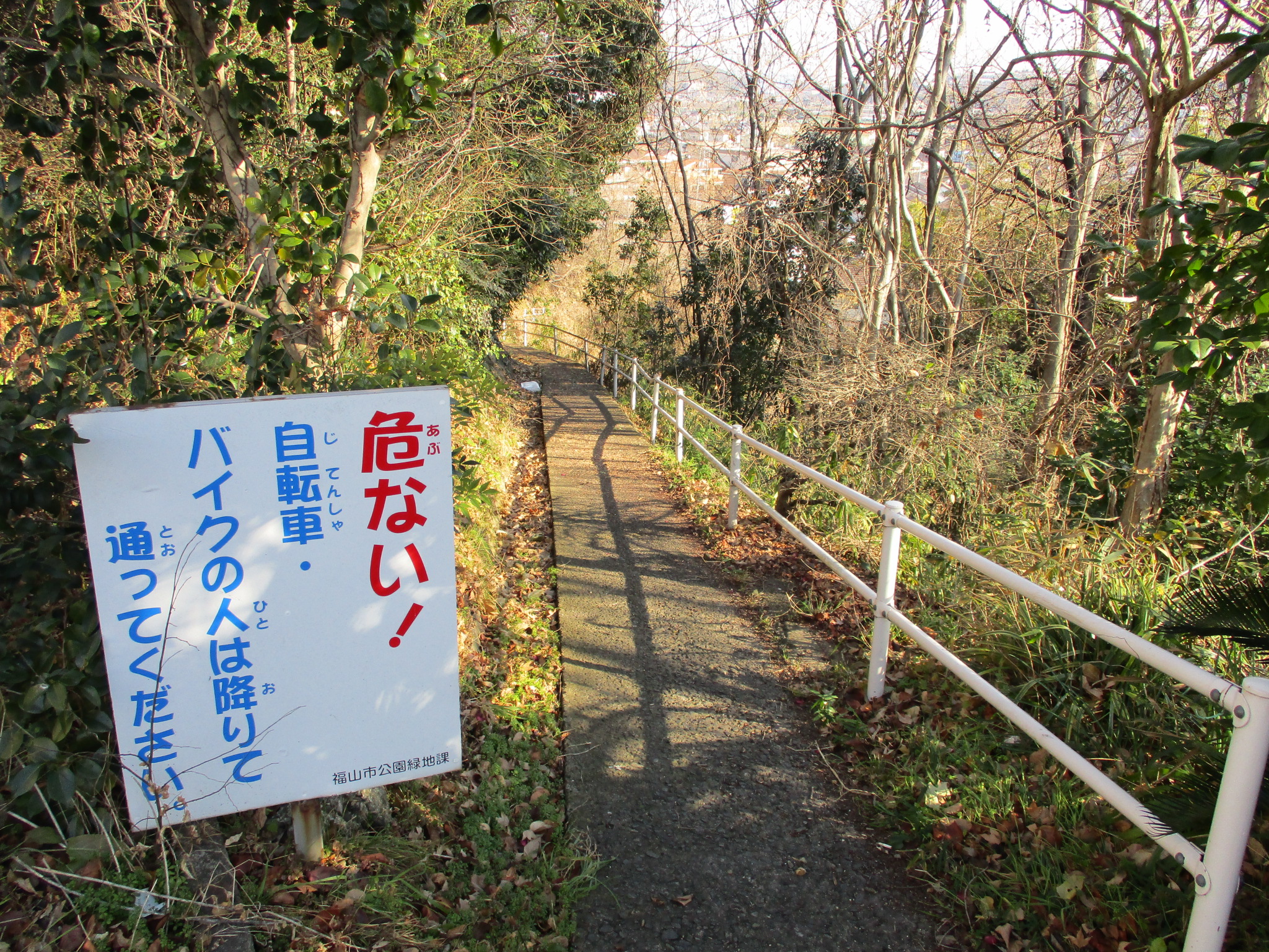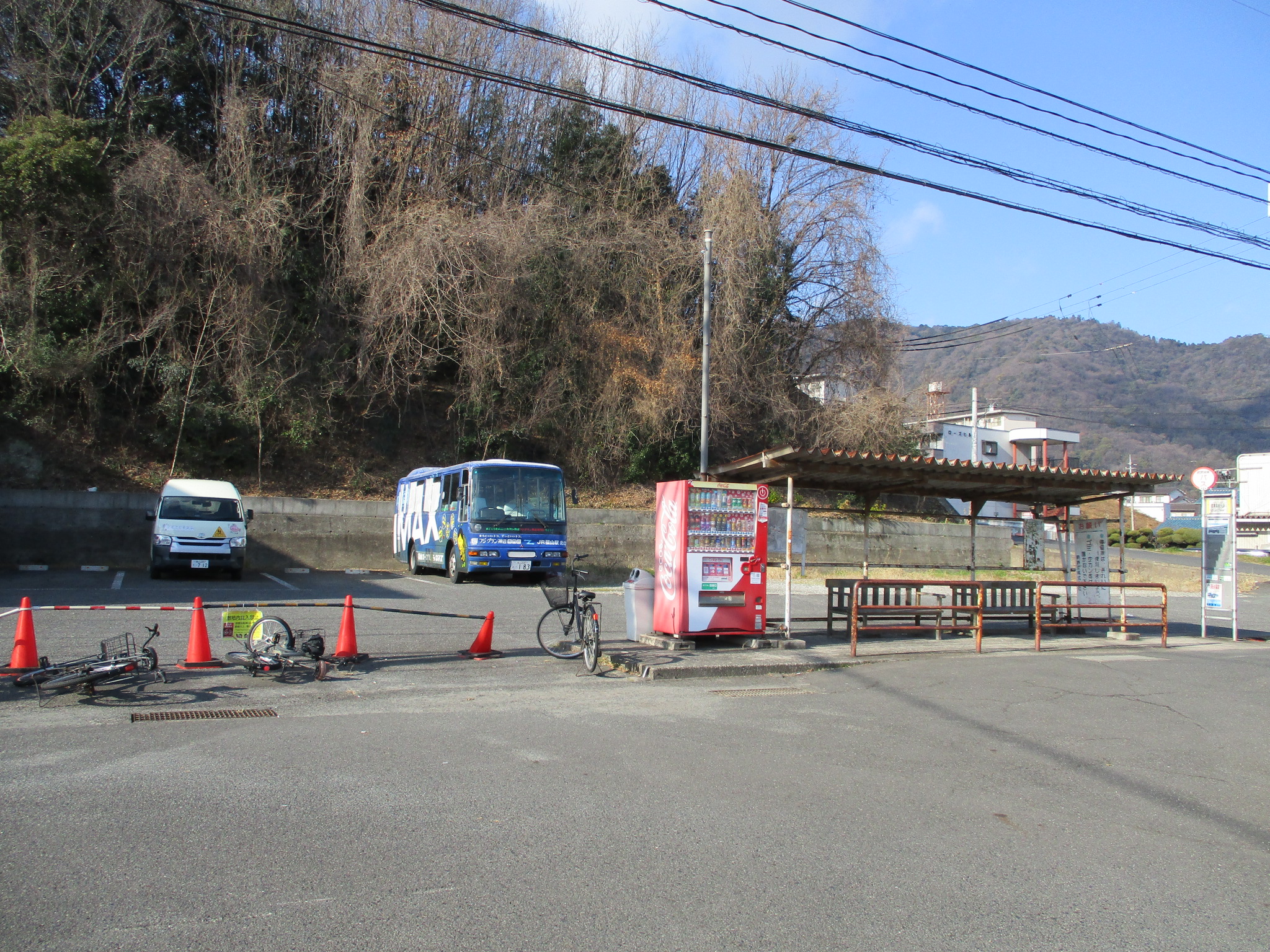 鞆鉄道バス「商業高校前」停留所。「しまなみ信用金庫」の跡地が貸切バスの置き場になっている。